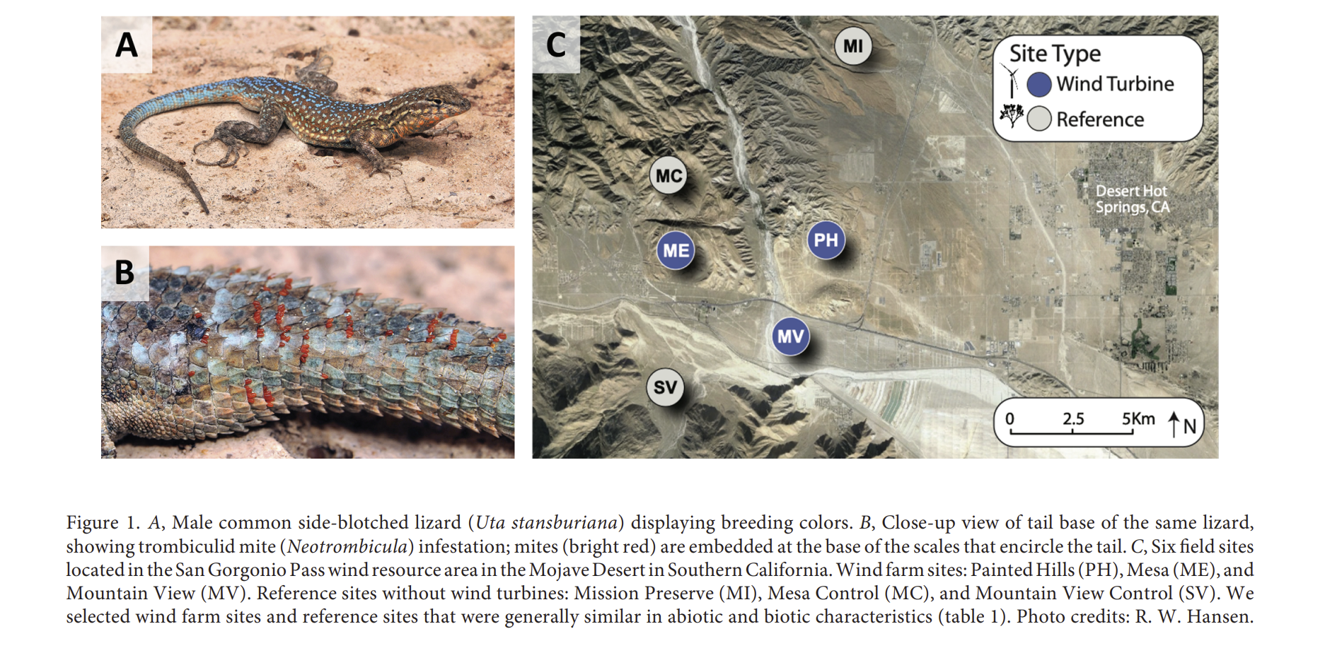 Photo from Alaasam VJ, Keehn JE, Durso AM, French SS, Feldman CR. 2020. Ectoparasite Load Is Reduced in Side-Blotched Lizards (Uta stansburiana) at Wind Farms: Implications for Oxidative Stress. Physiological and Biochemical Zoology. 94(1). doi: 10.1086/712100